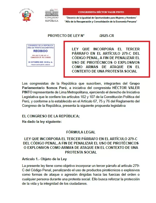 El congresista Héctor Valer, del grupo parlamentario Somos Perú, presentó el Proyecto de Ley N.º /2025-CR que propone sancionar el uso de pirotécnicos en protestas cuando estos sean empleados como armas de ataque. La iniciativa plantea modificar el Código Penal para incorporar una agravante específica aplicable a manifestaciones donde se utilicen artefactos explosivos con intención de causar daño.