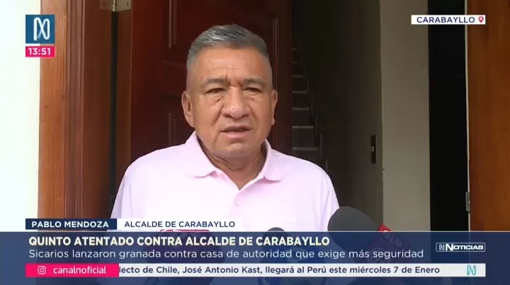 El alcalde de Carabayllo, Pablo Mendoza, denunció haber sido víctima de un nuevo atentado, luego de que dos delincuentes arrojaron una granada tipo piña contra su vivienda la noche del sábado. El hecho ocurrió en la zona de El Progreso y fue el quinto ataque contra su persona desde su etapa como candidato municipal, según afirmó el propio burgomaestre.