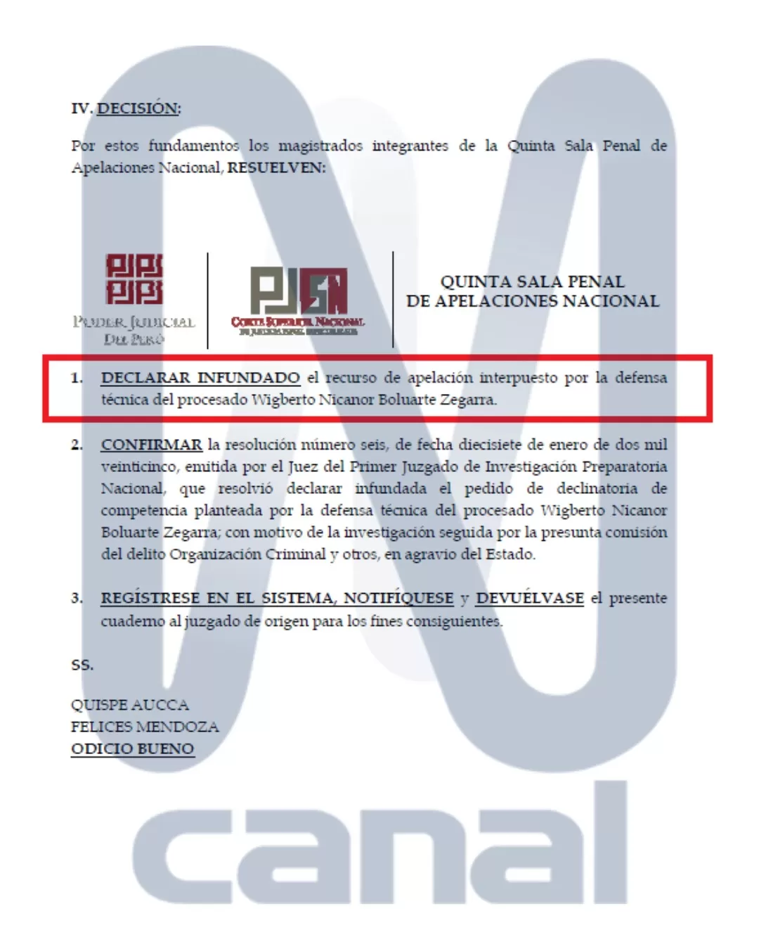 La resolución, emitida por la Quinta Sala Penal de Apelaciones Nacional, confirma que el magistrado del Primer Juzgado de Investigación Preparatoria Nacional seguirá a cargo de la investigación por presuntos delitos de organización criminal, tráfico de influencias y cohecho, en agravio del Estado.