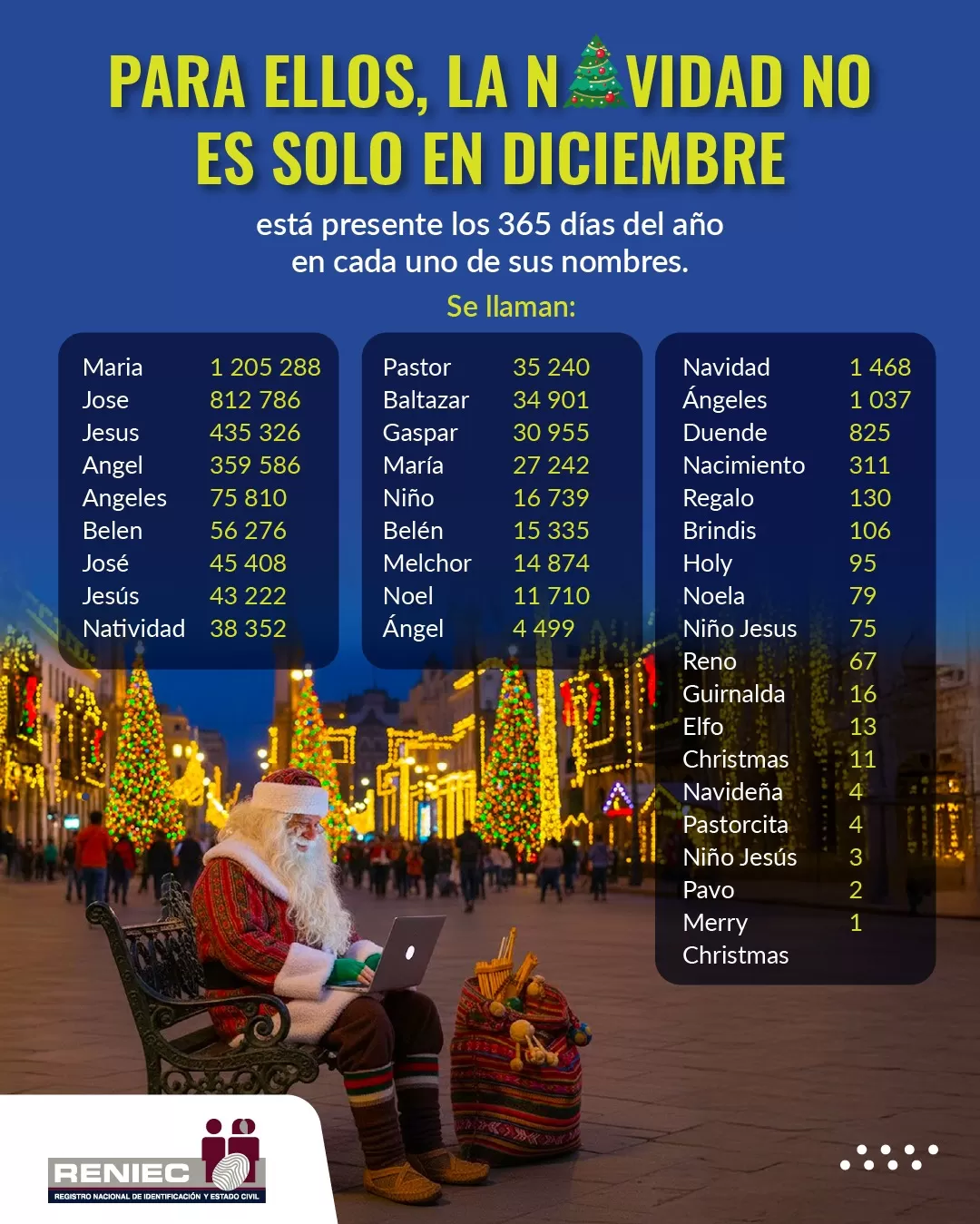 El Registro Nacional de Identificación y Estado Civil (Reniec) difundió un reporte oficial sobre los nombres inspirados en la Navidad que portan los ciudadanos en el territorio peruano. La institución detalló que las denominaciones varían desde figuras bíblicas tradicionales hasta términos contemporáneos asociados a la festividad.
