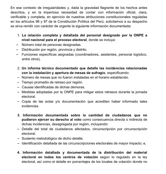 El grupo parlamentario sostiene que la ONPE no cumplió con la entrega oportuna de materiales electorales en diversos locales de votación a nivel nacional. Esta falta de transparencia logística provocó un retraso crítico en la instalación de las mesas, afectando principalmente a los ciudadanos en Lima Metropolitana y el extranjero.