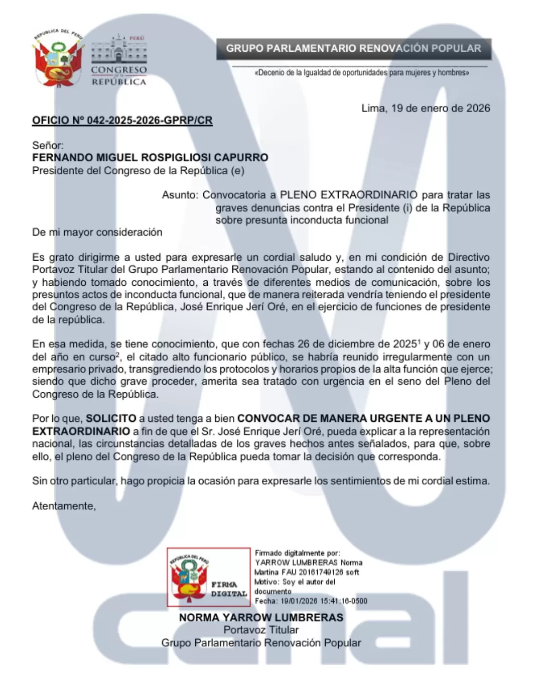 La bancada de Renovación Popular solicitó formalmente al Congreso de la República la convocatoria de un Pleno Extraordinario para abordar las denuncias por presunta inconducta funcional contra el presidente interino José Jerí. El pedido fue presentado el 19 de enero de 2026 mediante un oficio suscrito por la congresista Norma Yarrow, portavoz titular del grupo parlamentario.