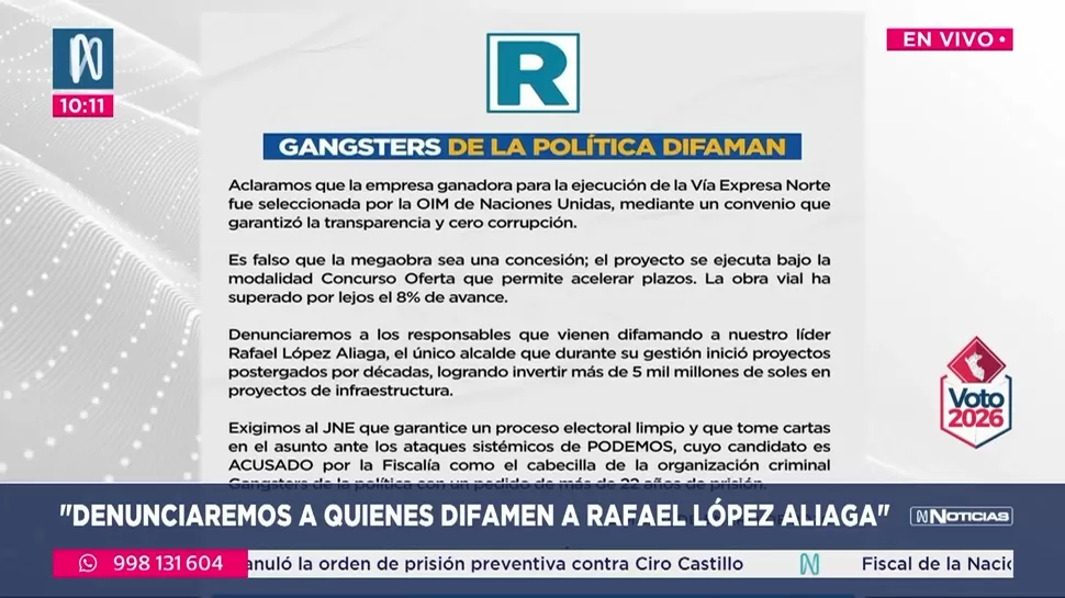 El partido Renovación Popular rechazó acusaciones sobre la Vía Expresa Norte y anunció acciones legales contra quienes difamen a Rafael López Aliaga