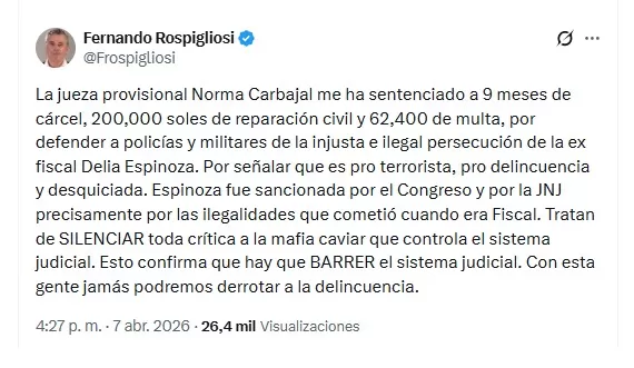 El proceso se originó por declaraciones de Fernando Rospigliosi en la red social X. En ellas calificó a Delia Espinoza como “aliada del terrorismo”.