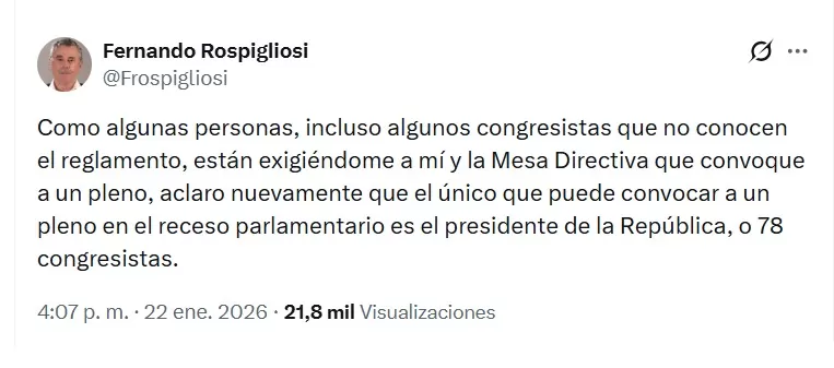 "Como algunas personas, incluso algunos congresistas que no conocen el reglamento, están exigiéndome a mí y la Mesa Directiva que convoque a un pleno, aclaro nuevamente que el único que puede convocar a un pleno en el receso parlamentario es el presidente de la República, o 78 congresistas", escribió Rospigliosi.
