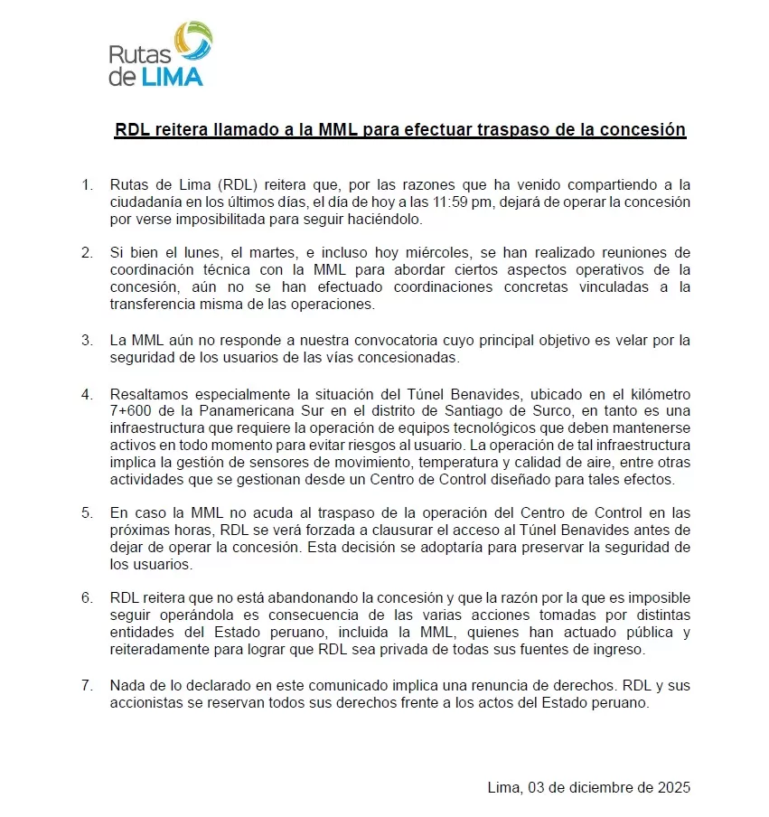 La empresa Rutas de Lima reiteró este 3 de diciembre su llamado a la Municipalidad Metropolitana de Lima (MML) para realizar el traspaso formal de la concesión de vías, afirmando que dejará de operar a las 11:59 p. m. por encontrarse imposibilitada de continuar con la prestación del servicio. En su más reciente comunicado, advirtió que, si la comuna limeña no asiste a la transferencia de operaciones del Centro de Control, se verán forzados a clausurar el acceso al túnel Benavides por motivos de seguridad vial.