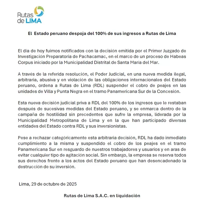 Rutas de Lima suspendió el cobro de peajes en Villa y Punta Negra tras una orden del Poder Judicial, que acogió en parte un hábeas corpus por vulneración del derecho al libre tránsito. La empresa calificó el fallo como ilegal y denunció que lo priva del 100% de sus ingresos. Aunque acató la medida por razones de seguridad, anunció que se reserva el derecho de iniciar acciones legales. La concesionaria afronta un proceso de disolución desde septiembre debido a pérdidas económicas. La medida judicial no prejuzga la validez del contrato de concesión firmado en 2013 con la Municipalidad de Lima.