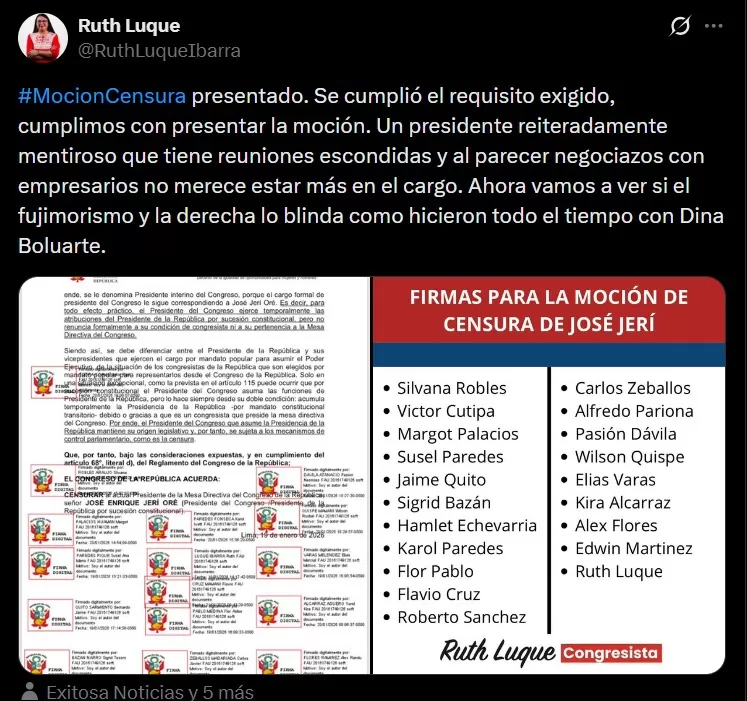 La congresista Ruth Luque presentó formalmente una moción de censura contra José Jerí en su calidad de presidente del Congreso de la República.