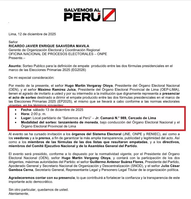 El partido político Salvemos al Perú ha anunciado la realización de un sorteo público mediante el lanzamiento de una moneda para resolver el empate entre dos fórmulas presidenciales registrado durante sus Elecciones Primarias 2025. El evento se llevará a cabo este sábado 13 de diciembre de 2025, a las 2:00 p.m., en la sede partidaria ubicada en el jirón Camaná N.º 989, Cercado de Lima.