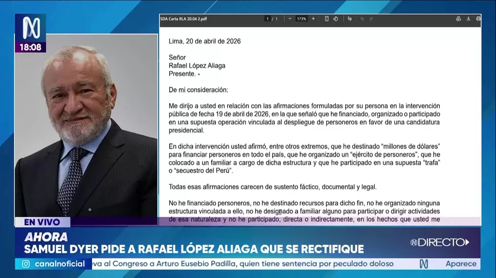 Ante lo que considera afirmaciones sin sustento, Samuel Dyer ha solicitado formalmente que Rafael López Aliaga se rectifique públicamente en un plazo no mayor a 48 horas. La exigencia especifica que dicha rectificación debe realizarse en los mismos espacios y con una relevancia equivalente a la intervención original, precisando que no existen pruebas para atribuirle los hechos descritos.