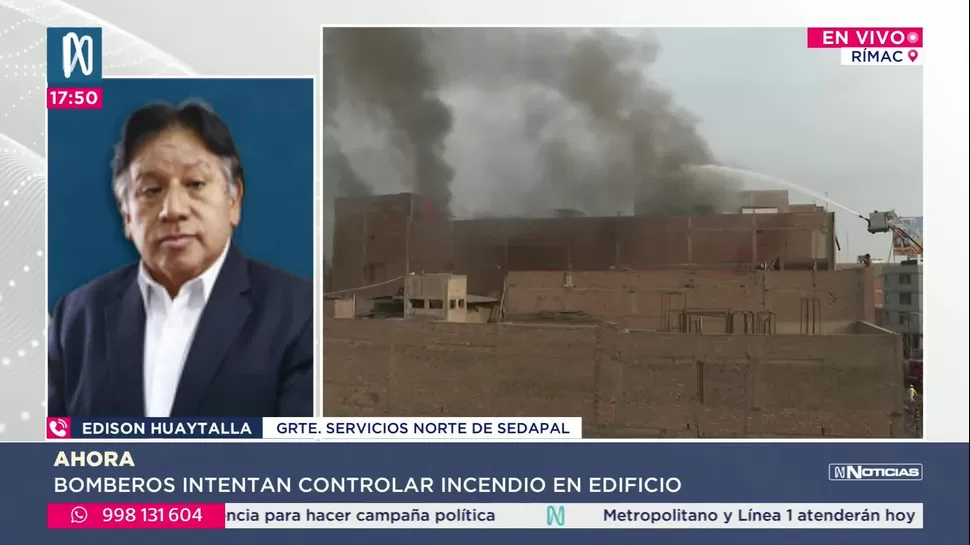 El gerente de Servicios Norte de Sedapal, Edison Huaytalla, informó que la entidad ha elevado la presión del agua en la zona del incendio en el Rímac como medida de apoyo a la labor del Cuerpo de Bomberos. Según explicó, se activó el sistema SCADA para garantizar una adecuada distribución hídrica en el sector 201, que incluye avenidas como Prolongación Tacna y Francisco Pizarro.