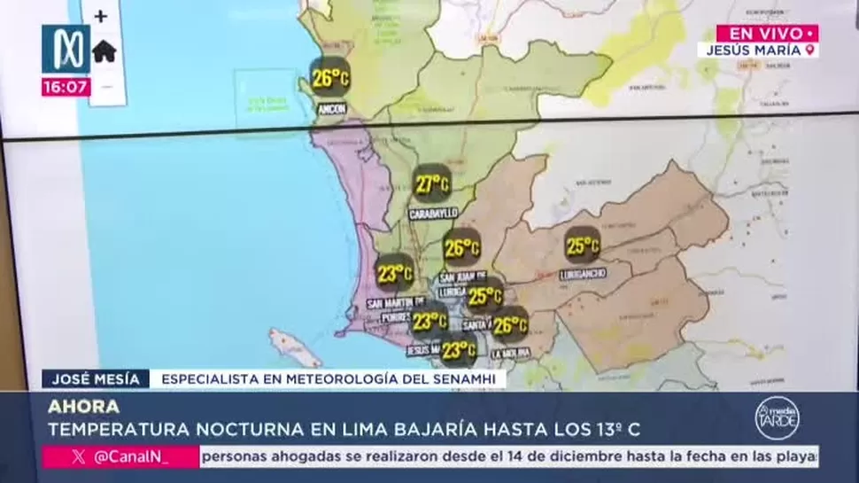 Según explicó José Mesía, especialista en meteorología del Senamhi, distritos del litoral como Miraflores, Chorrillos y Callao registrarán temperaturas mínimas nocturnas de entre 17 y 18 °C. Aunque el descenso no representa una ola de frío, la entidad recomienda tomar precauciones ante noches más frescas.