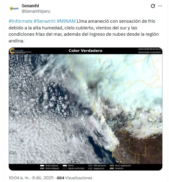 La especialista en meteorología del Senamhi, Raquel Loayza, explicó que estos factores atmosféricos seguirán generando cielos cubiertos, neblina y precipitaciones ligeras durante las primeras horas del día. Las condiciones actuales no permitirán alcanzar los valores de temperatura observados a fines de noviembre.