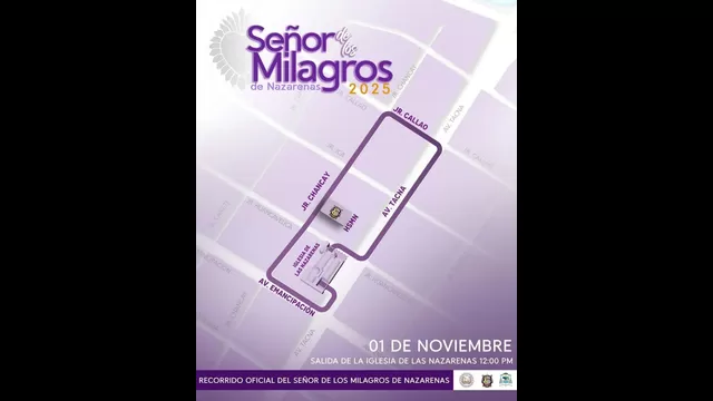 Según el recorrido, compartido por la Hermandad del Señor de los Milagros, este iniciará su recorrido en el Santuario de Las Nazarenas, ubicado en el Centro de Lima, luego pasará por la avenida Tacna, jirón Callao, jirón Chancay y por la avenida Emancipación. La salida está pactada para el medio día y se estima que dure hasta las 6:00 p.m.