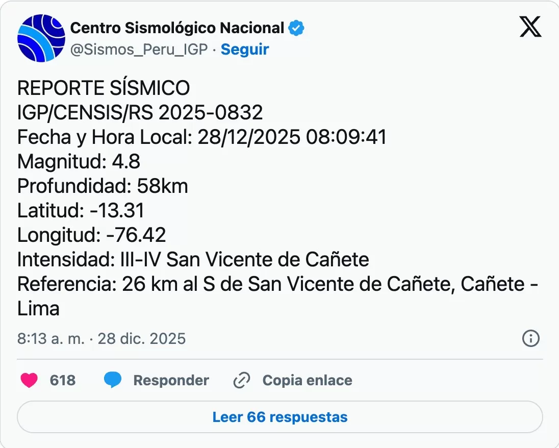 De acuerdo con el reporte oficial, el epicentro del temblor se localizó a 26 kilómetros al sur de San Vicente de Cañete, a una profundidad de 58 kilómetros, lo cual explicaría su percepción moderada en superficie y la ausencia de afectaciones significativas.
