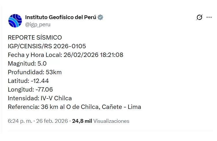 Un sismo de magnitud 5 se registró la tarde del jueves 26 de febrero de 2026 en la región Lima. El Instituto Geofísico del Perú (IGP) indicó que el movimiento telúrico ocurrió a las 6:21 p.m., con epicentro a 36 kilómetros al oeste de Chilca, Cañete, Lima.