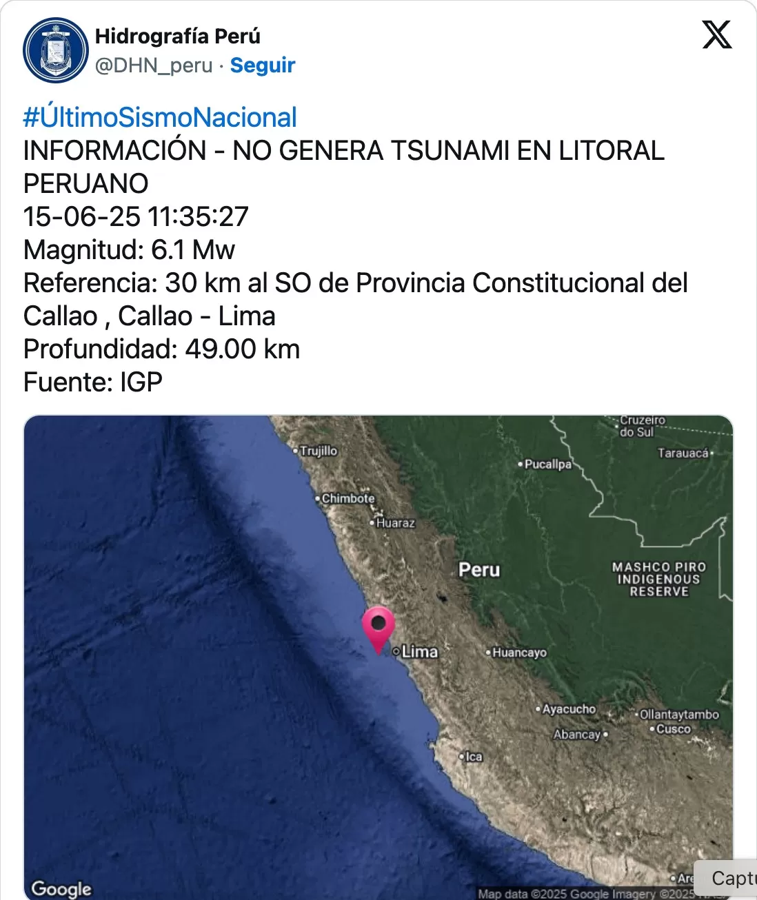 Un fuerte sismo de magnitud 6.1 se registró esta mañana en Lima y Callao, causando alarma entre los ciudadanos. Según el Instituto Geofísico del Perú (IGP), el movimiento telúrico ocurrió a las 11:35 a.m., con epicentro a 30 kilómetros al suroeste de la Provincia Constitucional del Callao y a una profundidad de 49 kilómetros.