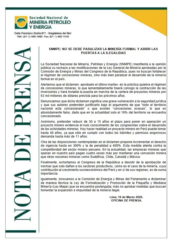 A través de un comunicado público emitido el 19 de marzo de 2026, la SNMPE cuestionó el contenido del dictamen aprobado y advirtió sobre sus posibles efectos en el desarrollo de la minería formal.