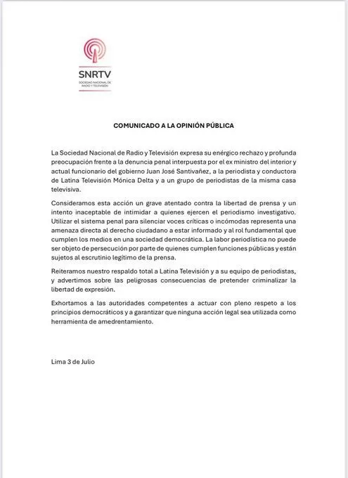 La Sociedad Nacional de Radio y Televisión (SNRTV) emitió un comunicado en el que expresa su enérgico rechazo a la denuncia penal interpuesta por el exministro del Interior Juan José Santiváñez contra la periodista Mónica Delta y otros integrantes del equipo periodístico de Latina Televisión. La organización considera que esta acción representa una grave amenaza contra la libertad de prensa en el país.