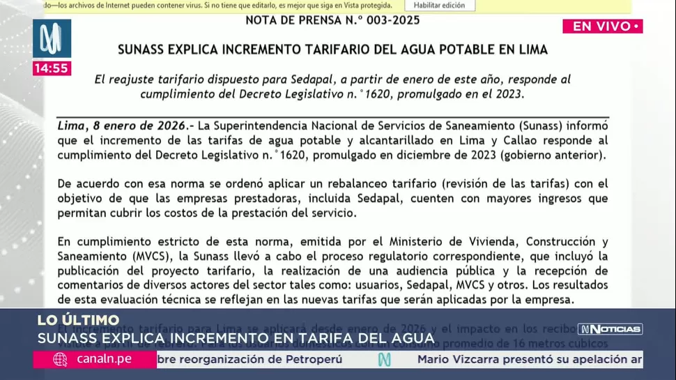 La Superintendencia Nacional de Servicios de Saneamiento (Sunass) confirmó el incremento de las tarifas de agua potable y alcantarillado en Lima y Callao, vigente desde enero de 2026. La medida responde a un proceso regulatorio aprobado el año pasado.