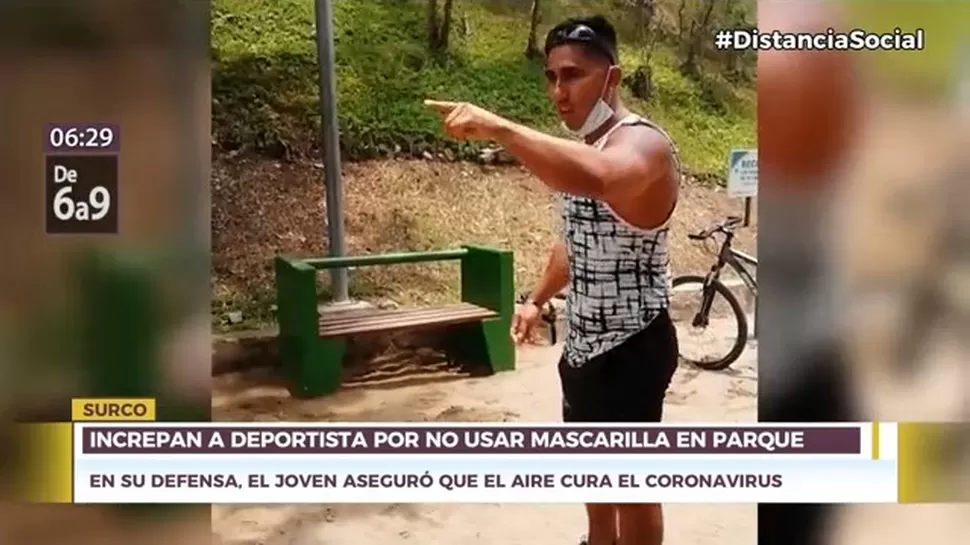 En otro momento, el sujeto aseguró que "el aire cura el coronavirus". Con la llegada de un agente del serenazgo y de la Policía, el hombre accedió a ponerse la mascarilla.
