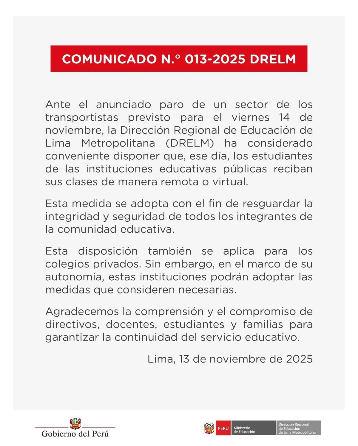 El Minedu, a través de la Dirección Regional de Educación de Lima Metropolitana (DRELM), dispuso que las clases del viernes 14 de noviembre se realicen de manera virtual ante el paro de transportistas