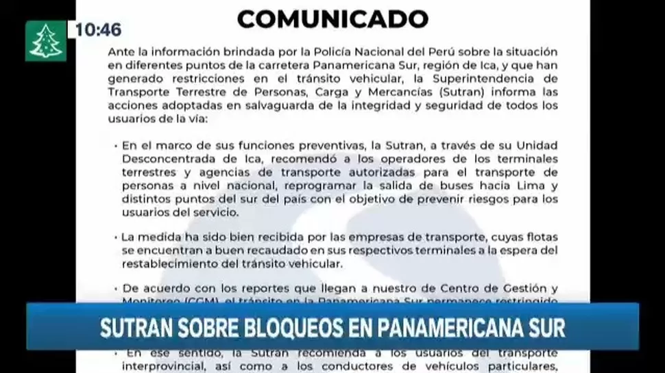 En ese sentido, la entidad recomendó a los operadores de los terminales terrestres y agencias de transporte autorizadas reprogramar la salida de buses hacia Lima y distintos puntos del sur del país con el objetivo de prevenir riesgos para los usuarios del servicio.