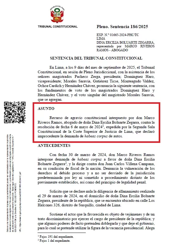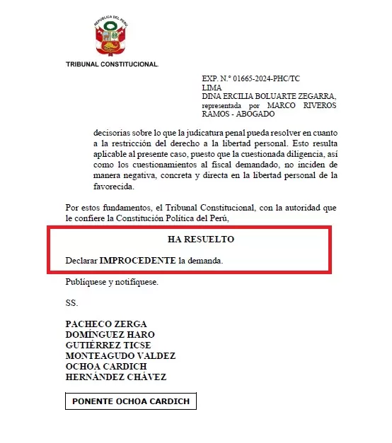 El Tribunal Constitucional (TC) declaró improcedente el hábeas corpus presentado a favor de la expresidenta Dina Boluarte, que buscaba anular el allanamiento a su vivienda ejecutado el 29 de marzo de 2024. La sentencia se basa en que las actuaciones del Ministerio Público, al ser de carácter postulatorio, no afectan de forma directa la libertad personal.