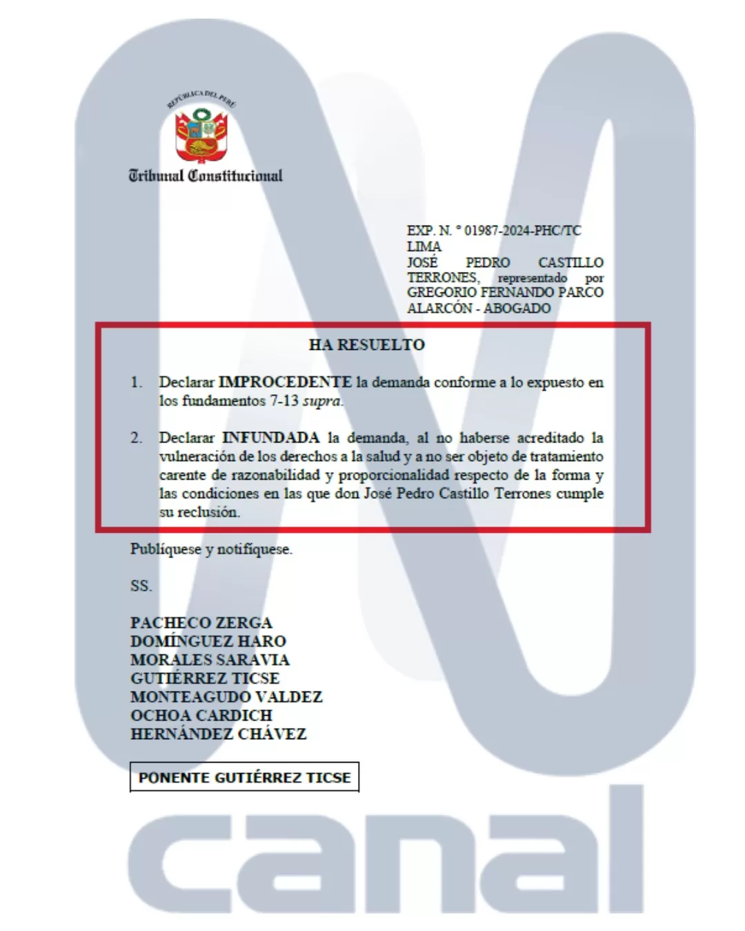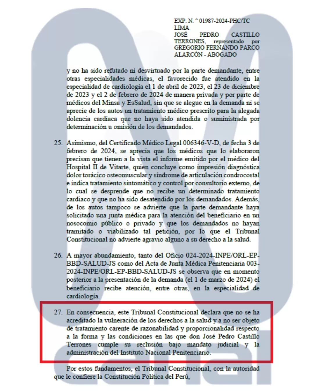 La sentencia concluye declarando infundado el extremo del recurso que alegaba una presunta vulneración al derecho a la salud y declara improcedentes las demás solicitudes. El fallo confirma que el exmandatario está recibiendo atención adecuada dentro del penal y que no existe evidencia de negligencia por parte de las autoridades carcelarias.