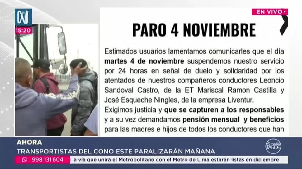 Una paralización del servicio de transporte ha sido anunciada para este martes 4 de noviembre por agrupaciones del sector en Lima Metropolitana. La protesta responde al incremento de la inseguridad ciudadana y a los recientes asesinatos de conductores en distintos distritos de la capital. La empresa “La 50 Transporte Unido del Cono Este de San Juan de Lurigancho” confirmó su participación mediante un comunicado público.