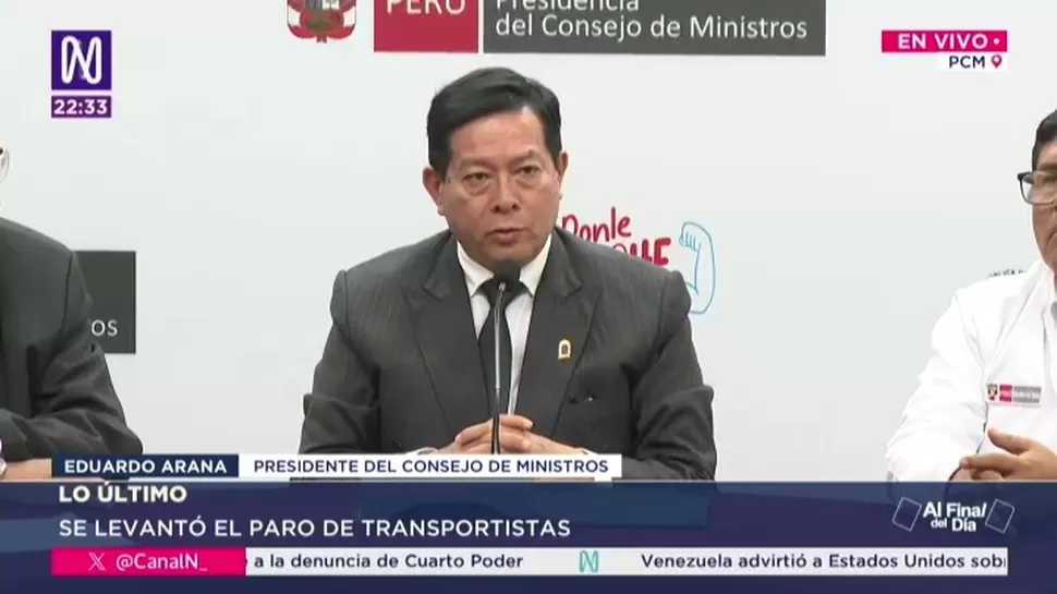 El presidente del Consejo de Ministros, Eduardo Arana, informó que los gremios de transportistas decidieron levantar el paro nacional luego de una reunión de tres horas con representantes del Ejecutivo en la sede de la Presidencia del Consejo de Ministros.