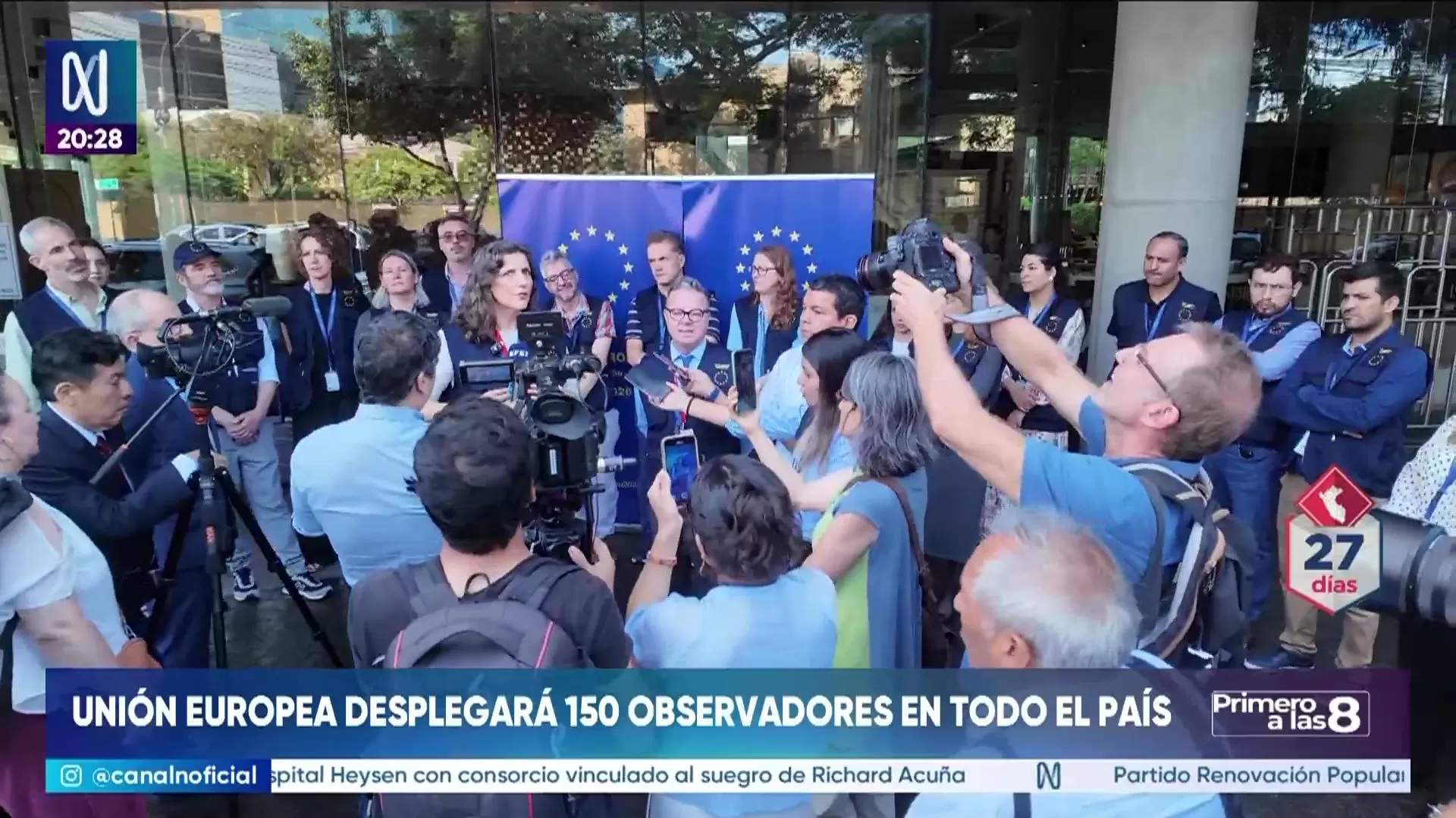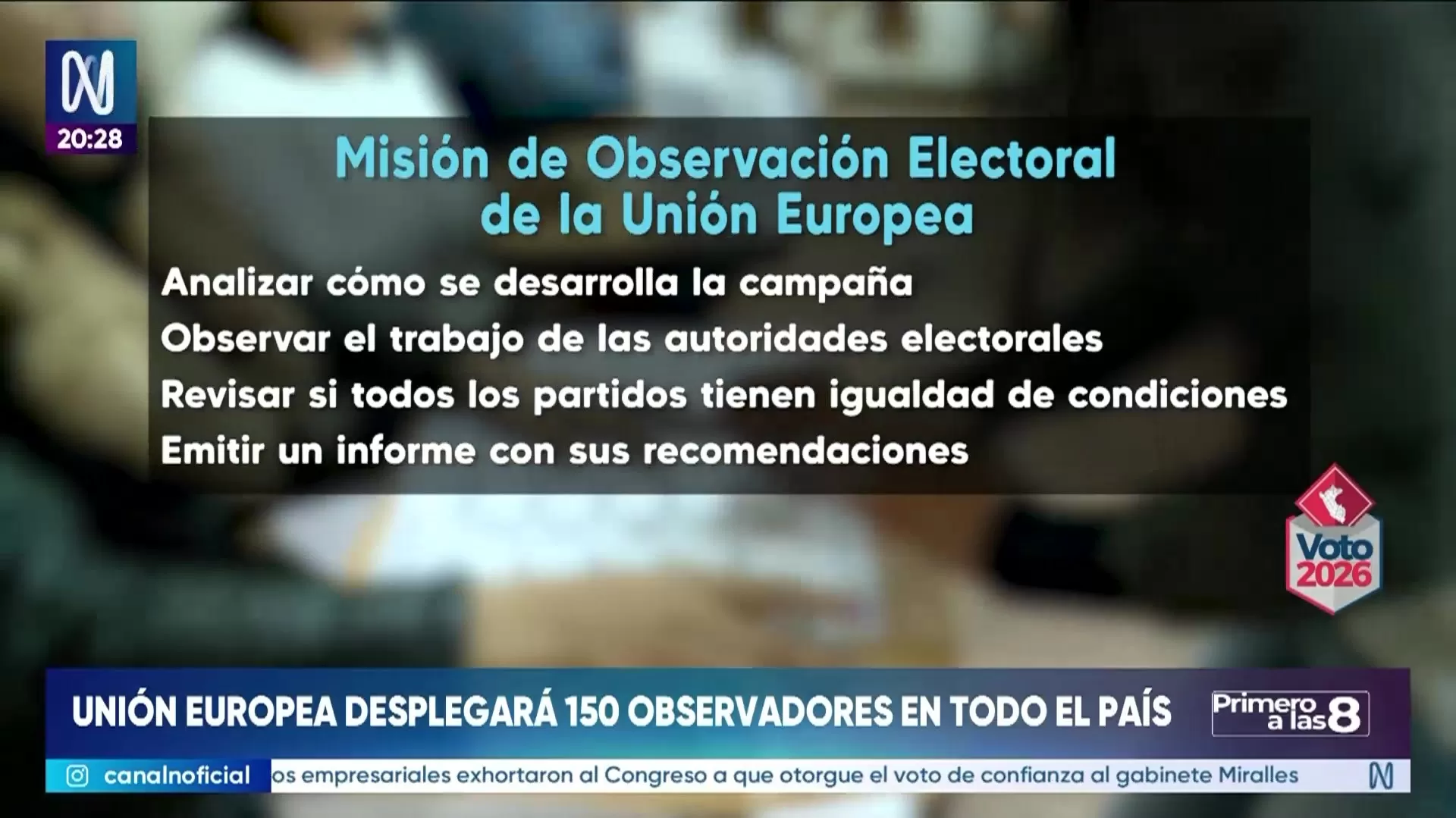La Unión Europea desplegará una misión de observación electoral integrada por 150 observadores para supervisar las elecciones generales en Perú. El equipo se distribuirá en las 24 regiones del país para monitorear la campaña electoral, el trabajo de las autoridades electorales y el desarrollo de la votación. Inicialmente se enviaron 50 observadores de largo plazo y posteriormente se sumarán otros 50 para el seguimiento de los comicios, además de delegaciones adicionales. La misión elaborará informes preliminares después de la primera y segunda vuelta, mientras que el informe final será presentado dos meses después de concluido el proceso electoral.