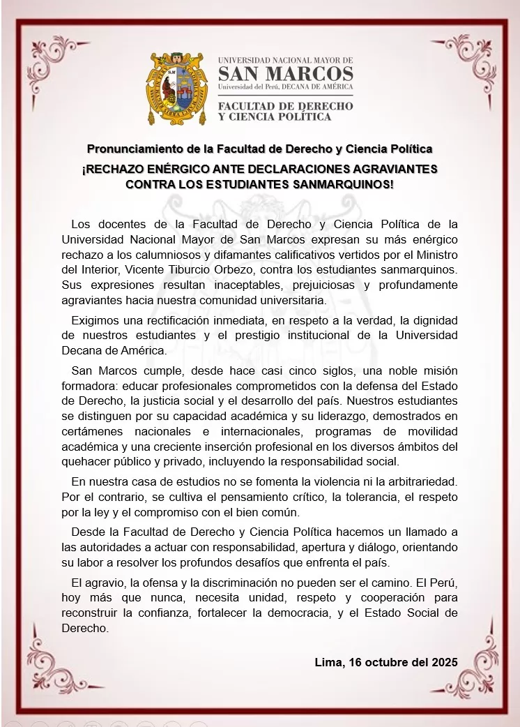 La Facultad de Derecho y Ciencia Política de la Universidad Nacional Mayor de San Marcos (UNMSM) rechazó públicamente las declaraciones brindadas por el ministro del Interior, Vicente Tiburcio, quien señaló que estudiantes de esta casa de estudios fueron los más violentistas durante las protestas del 15 de octubre en el centro de Lima. La facultad calificó dichas afirmaciones como agraviantes y exigió una rectificación inmediata por parte del titular del sector Interior.