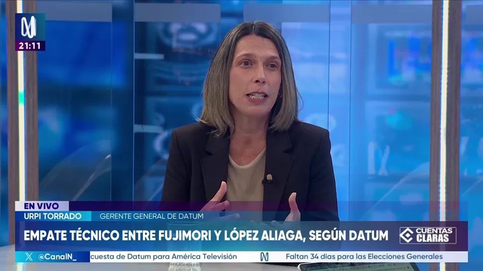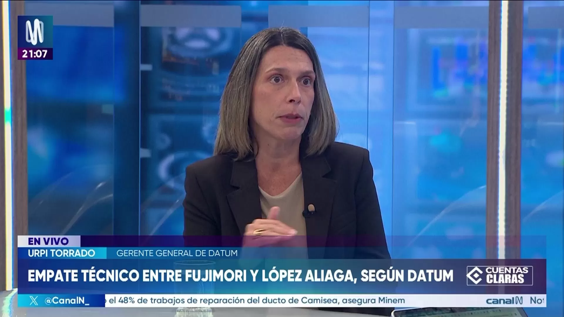 Urpi Torrado, gerenta general de Datum Internacional, afirmó que el proceso electoral 2026 registra niveles históricamente altos de indecisión e incertidumbre. Según explicó, 23% de los electores votaría en blanco o viciado y 15.5% aún no sabe por quién votar, lo que suma 38.5%. También señaló que el movimiento actual en la intención de voto ocurre entre candidatos ya elegidos y no por una reducción del bloque indeciso. Además, indicó que no se ha activado aún un voto en contra en primera vuelta. La entrevista también abordó el empate técnico entre Keiko Fujimori y Rafael López Aliaga y la caída del alcalde de Lima.