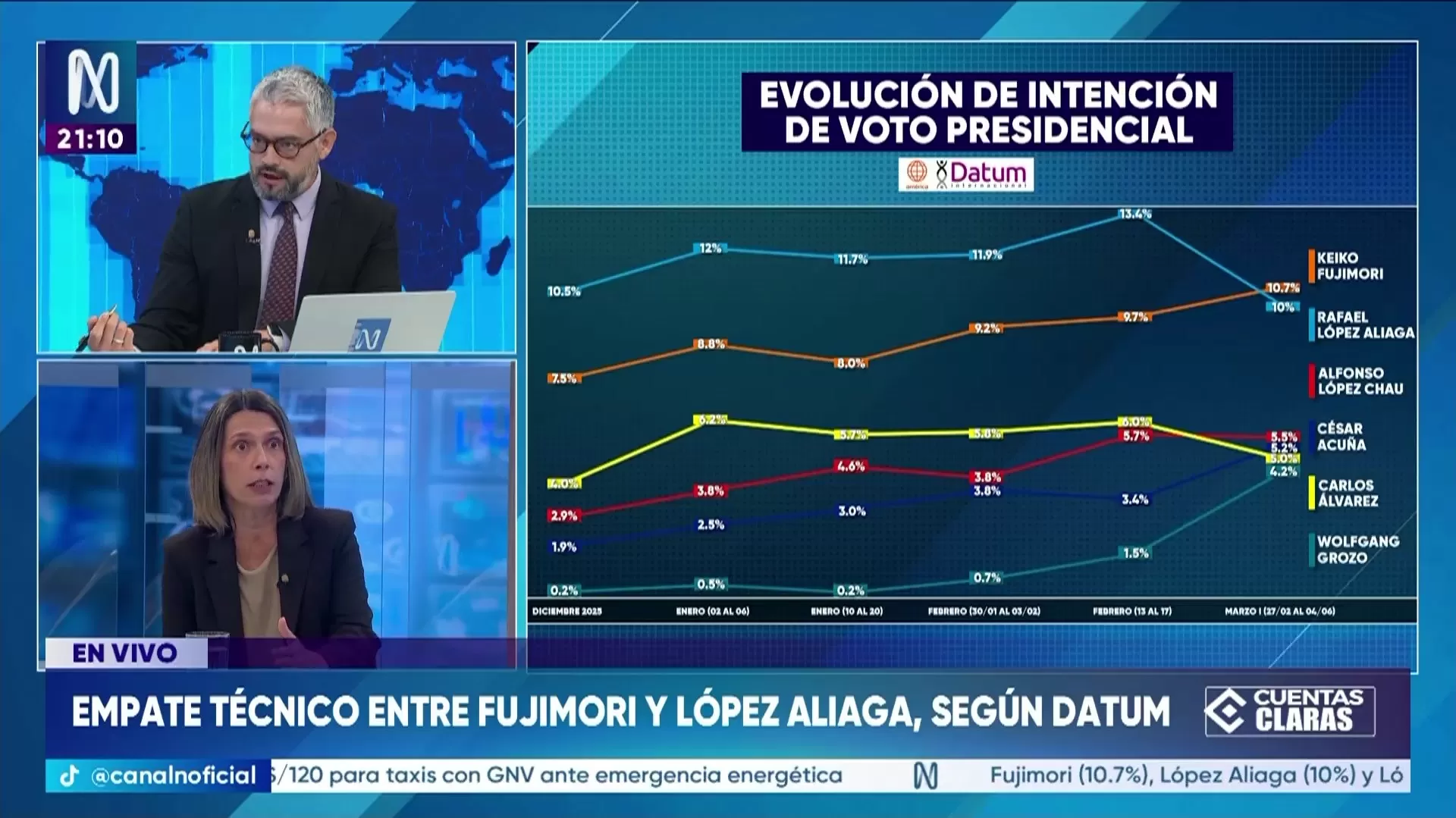 La ejecutiva de Datum indicó que esta es la primera vez que Keiko Fujimori se ubica por encima de Rafael López Aliaga dentro del margen de error. Añadió que la candidata mantiene una tendencia al alza, mientras que el exalcalde de Lima registra una caída respecto de semanas previas.