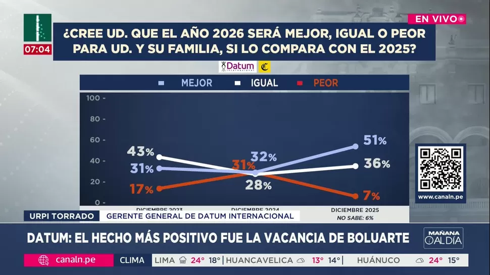 Entre 2023 y 2024, la percepción negativa se incrementó hasta alcanzar el 31%, mientras que ahora esta ha disminuido drásticamente. Según Urpi Torrado, gerente general de Datum, el optimismo está relacionado tanto con la estabilización económica como con el reciente cambio de gobierno.