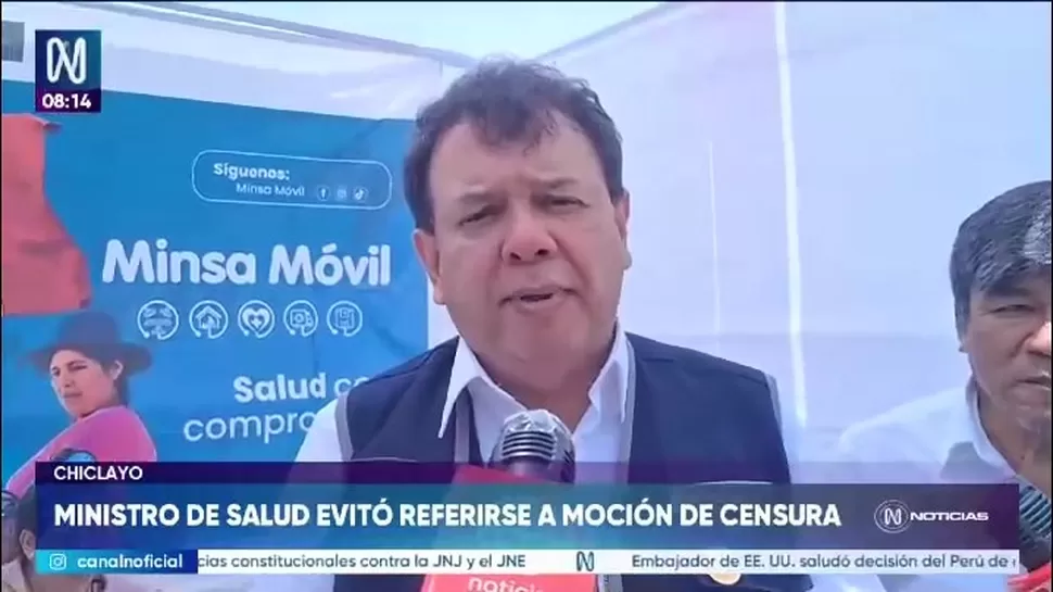 El ministro de Salud, Juan Carlos Velasco Guerrero, evitó pronunciarse sobre la moción de censura que circula en el Congreso de la República durante una actividad oficial en Lambayeque. El titular del sector señaló que el gabinete ministerial se encuentra enfocado exclusivamente en la ejecución de proyectos en beneficio de la ciudadanía.