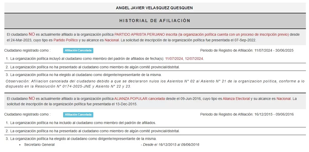 Según explicó Velásquez Quesquén, la cancelación masiva de afiliaciones se originó por una pugna interna en la Comisión Política del partido.