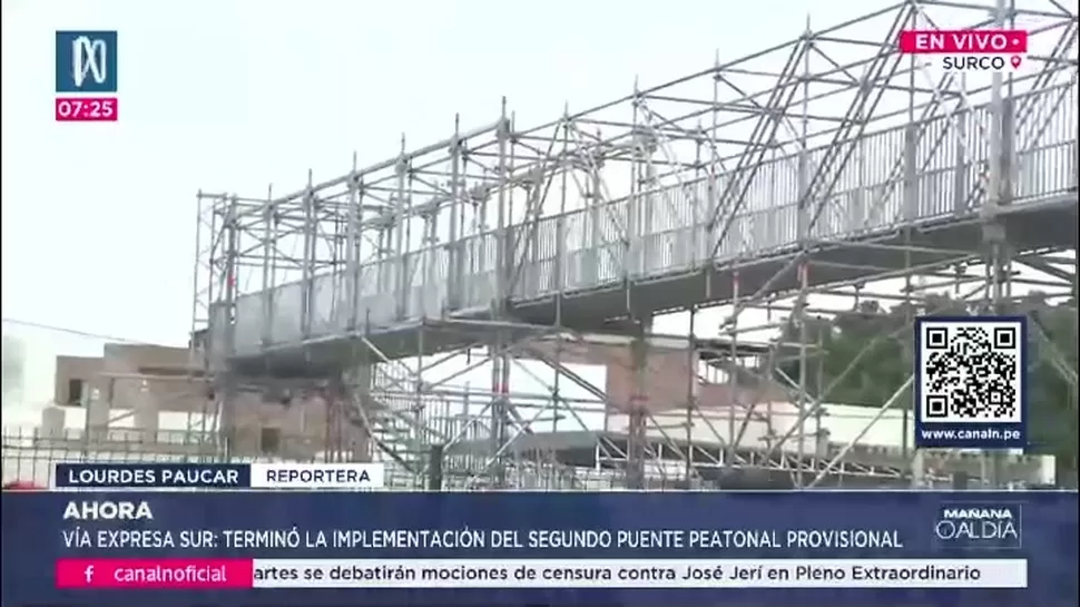 El segundo puente peatonal provisional en la Vía Expresa Sur, conocido como puente Doña Elsa, continúa en proceso de instalación en el distrito de Surco. En el lugar aún se observan andamios y barreras de concreto colocadas como medidas de seguridad.