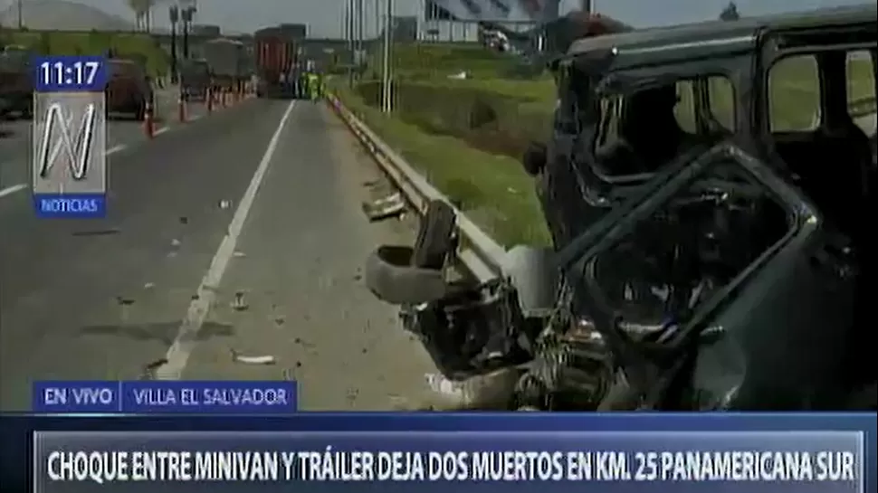 Un accidente se registró a la altura del kilómetro 25 de la carretera Panamericana Sur, en Villa El Salvador. Según se informó, se produjo un choque entre una minivan y un tráiler, que cobró la vida de dos personas.