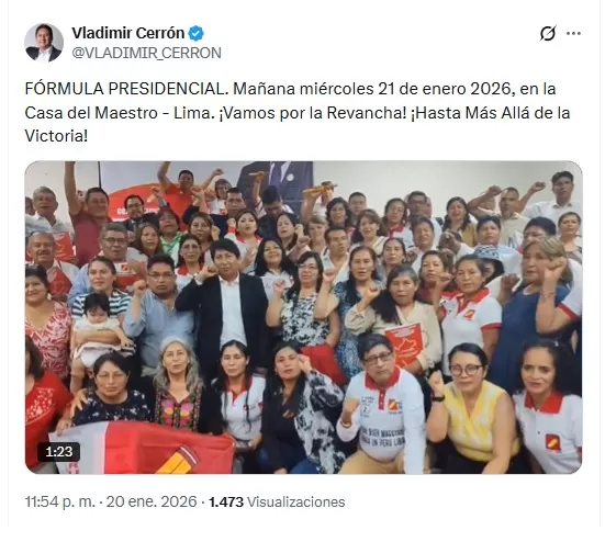 La aparición se dio durante un evento partidario transmitido de manera remota, donde el líder del partido presentó oficialmente a los integrantes de la fórmula presidencial. Vladimir Cerrón liderará la plancha acompañado por el congresista Flavio Cruz Mamani como primer vicepresidente y Bertha Rojas López como segunda vicepresidenta. Durante su intervención, saludó a las bases partidarias de todo el país y a los candidatos al nuevo Congreso bicameral.