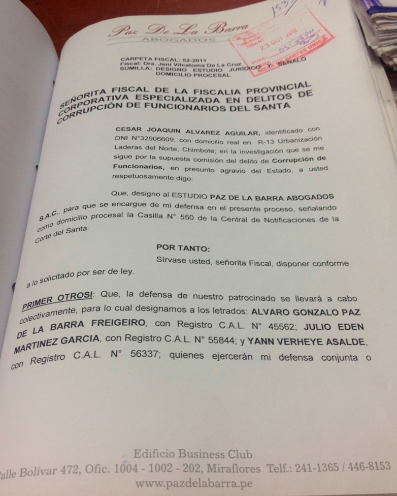 Así lo reveló Ideele radio al mostrar documentación que evidencia la relación de Verheye Asalde con el Estudio Paz de la Barra, donde se desempeñó como abogado senior. Es así que en octubre de 2012 fue acreditado como parte de la “defensa conjunta” de Álvarez Aguilar ante el Ministerio Público y el Poder Judicial por el caso La Centralita.