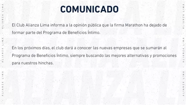 "El Club Alianza Lima informa a la opinión pública que la firma Marathon ha dejado de formar parte de su Programa de Beneficios Íntimo. En los próximos días el club dará a conocer las nuevas empresas que se sumarán al Programa de Beneficios Íntimo, siempre buscando las mejores alternativas y promociones para nuestros hinchas", señala el comunicado de la institución victoriana.