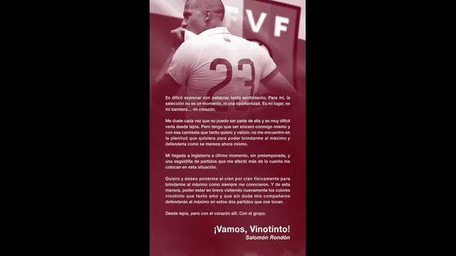 Rondón, quien asegura que para él "la selección no es un momento, ni una oportunidad", sino su "lugar", "bandera", "corazón", indica en un comunicado que le "duele" cada vez que no puede ser parte de ella y que le es "muy difícil verla desde lejos".