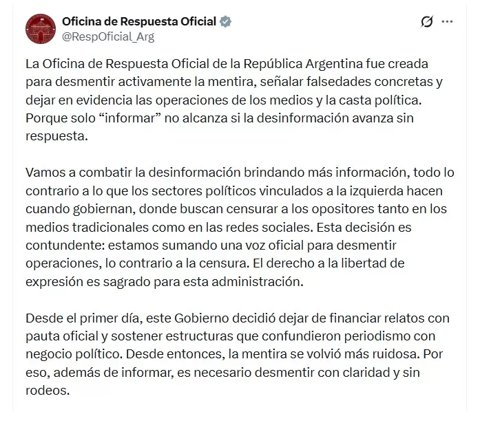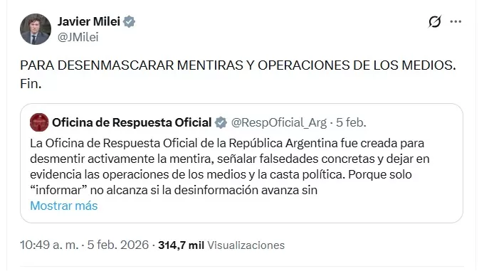 El presidente Javier Milei anunció la creación de la Oficina de Respuesta Oficial, un organismo que funcionará como una cuenta verificada en la red social X para combatir la desinformación. Según el Gobierno, su objetivo es desmentir falsedades y responder a operaciones de medios y actores políticos. La cuenta depende de la Secretaría de Comunicación y Prensa de la Jefatura de Gabinete y no tiene estructura formal en el Estado. Milei y varios funcionarios respaldaron la iniciativa, mientras que organizaciones periodísticas expresaron preocupación por su impacto en la relación entre el Gobierno y la prensa.