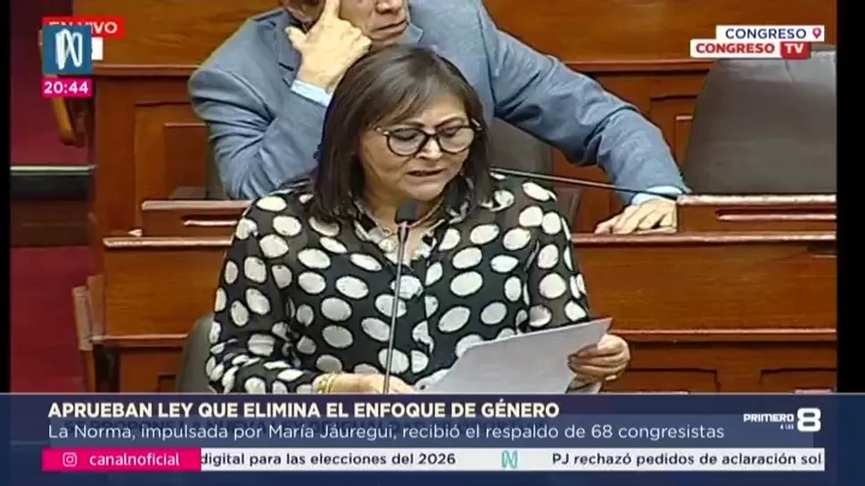 El Congreso de la República aprobó por mayoría una ley que elimina el uso del enfoque de género en políticas públicas, documentos oficiales y programas estatales. La norma fue respaldada por 68 votos a favor y fue impulsada por la congresista Milagros Jáuregui de Renovación Popular.