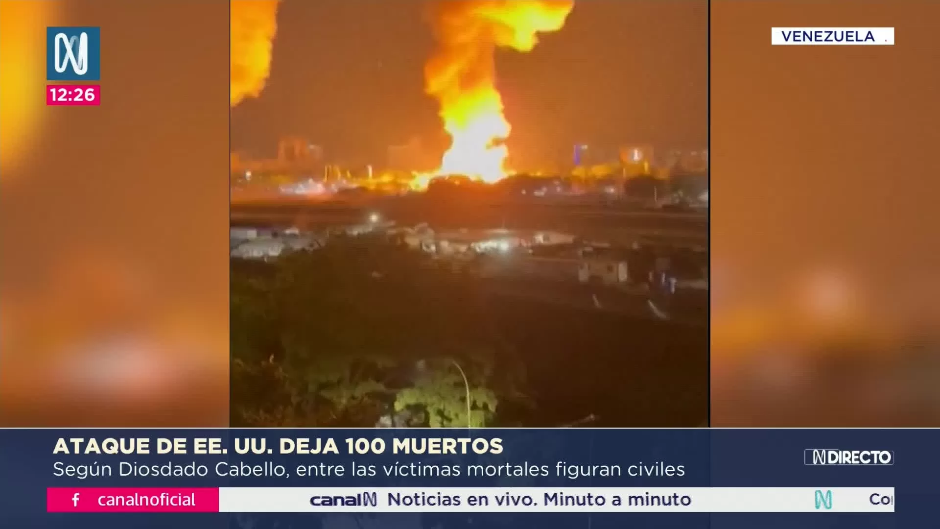 Diosdado Cabello informó que un ataque de Estados Unidos en Venezuela dejó hasta ahora 100 muertos y un número similar de heridos, y que el presidente Nicolás Maduro resultó lesionado en una pierna y Cilia Flores con un golpe en la cabeza. Cabello dijo que entre las víctimas figuran civiles y militares, y que el balance real continúa en evaluación. El fiscal general designó funcionarios para investigar las muertes, y Cuba informó que 32 de sus militares murieron en acciones combativas. Las autoridades realizaron un funeral por 24 soldados fallecidos en Caracas y tres estados cercanos.