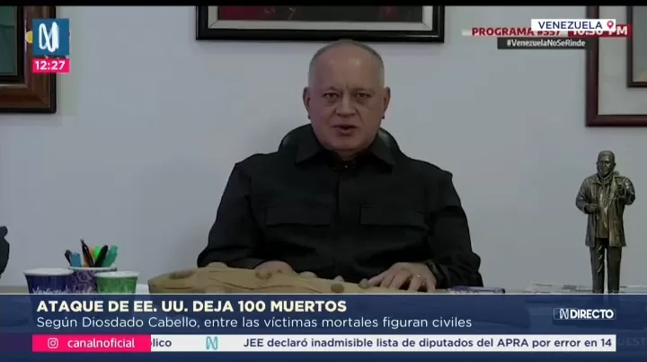 Diosdado Cabello dijo que el balance ofrecido por las autoridades venezolanas da cuenta de un elevado número de víctimas tras la operación militar estadounidense cuyo objetivo, según su relato, fue la captura del mandatario venezolano. Diosdado Cabello señaló que entre las víctimas figuran civiles que se hallaban en sus viviendas al momento de la acción, y que el hecho no puede ser ocultado.