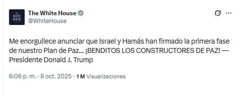“Estoy muy orgulloso de anunciar que tanto Israel como Hamás han aprobado la primera fase de nuestro plan de paz”, escribió Trump. Agregó que el pacto garantizará que “TODOS los rehenes serán liberados muy pronto, e Israel retirará sus tropas a una línea acordada, como los primeros pasos hacia una paz fuerte, duradera y eterna”.