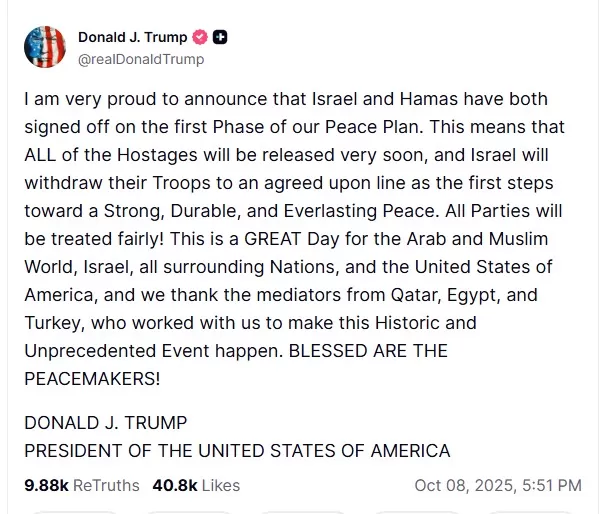 El presidente de Estados Unidos, Donald Trump, anunció que Israel y Hamás firmarán la primera fase de un acuerdo de paz en las próximas horas. El pacto incluye la liberación de rehenes, el retiro de tropas israelíes hacia una línea acordada dentro de Gaza y otros compromisos, según confirmó el propio mandatario en su red social Truth Social.